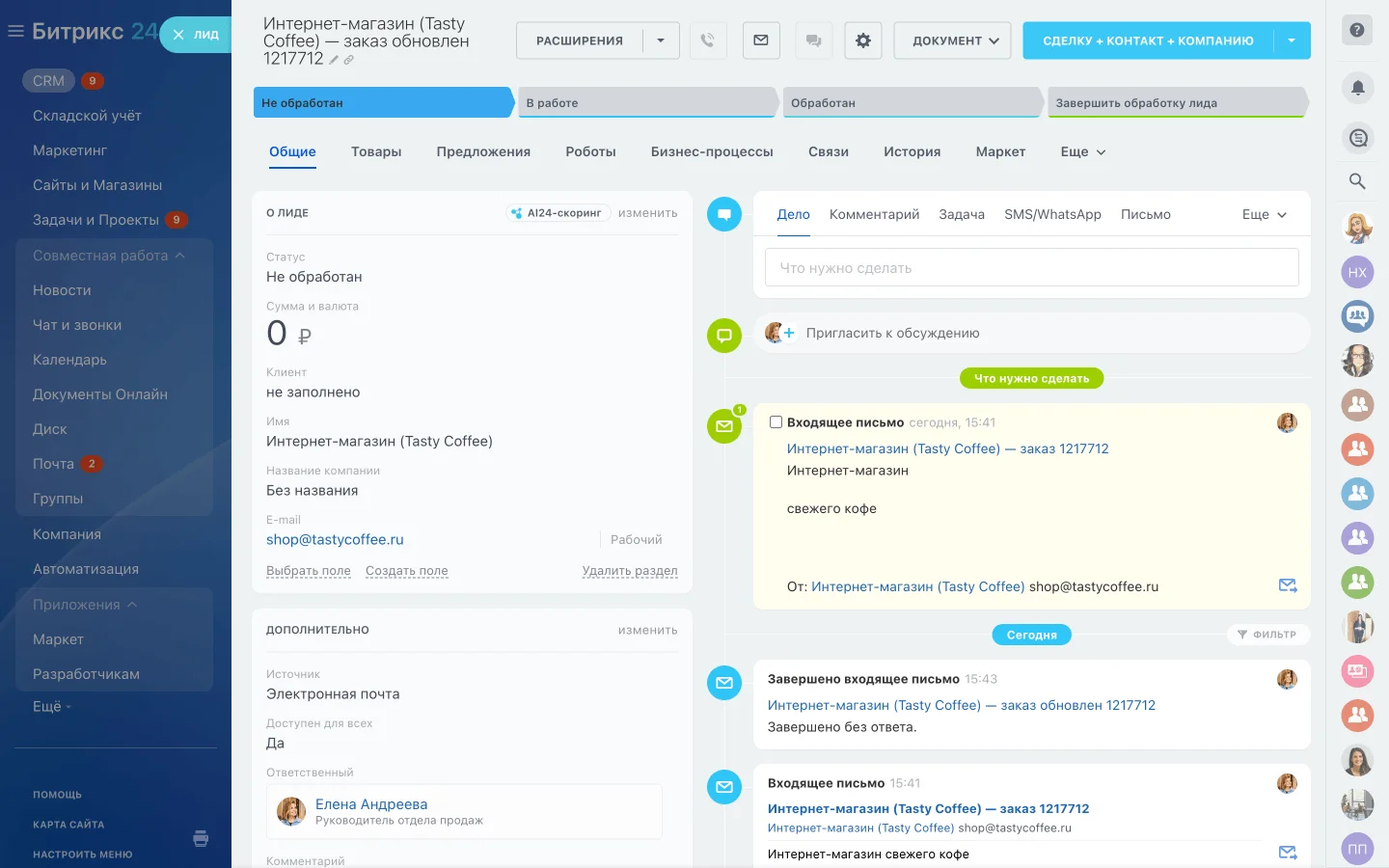 Она связана с другими инструментами Битрикс24: CRM, проектами и задачами, IP-телефонией, лентой новостей. Так, если клиент написал электронное письмо с просьбой оформить заказ, прямо из почты можно создать карточку сделки в CRM.