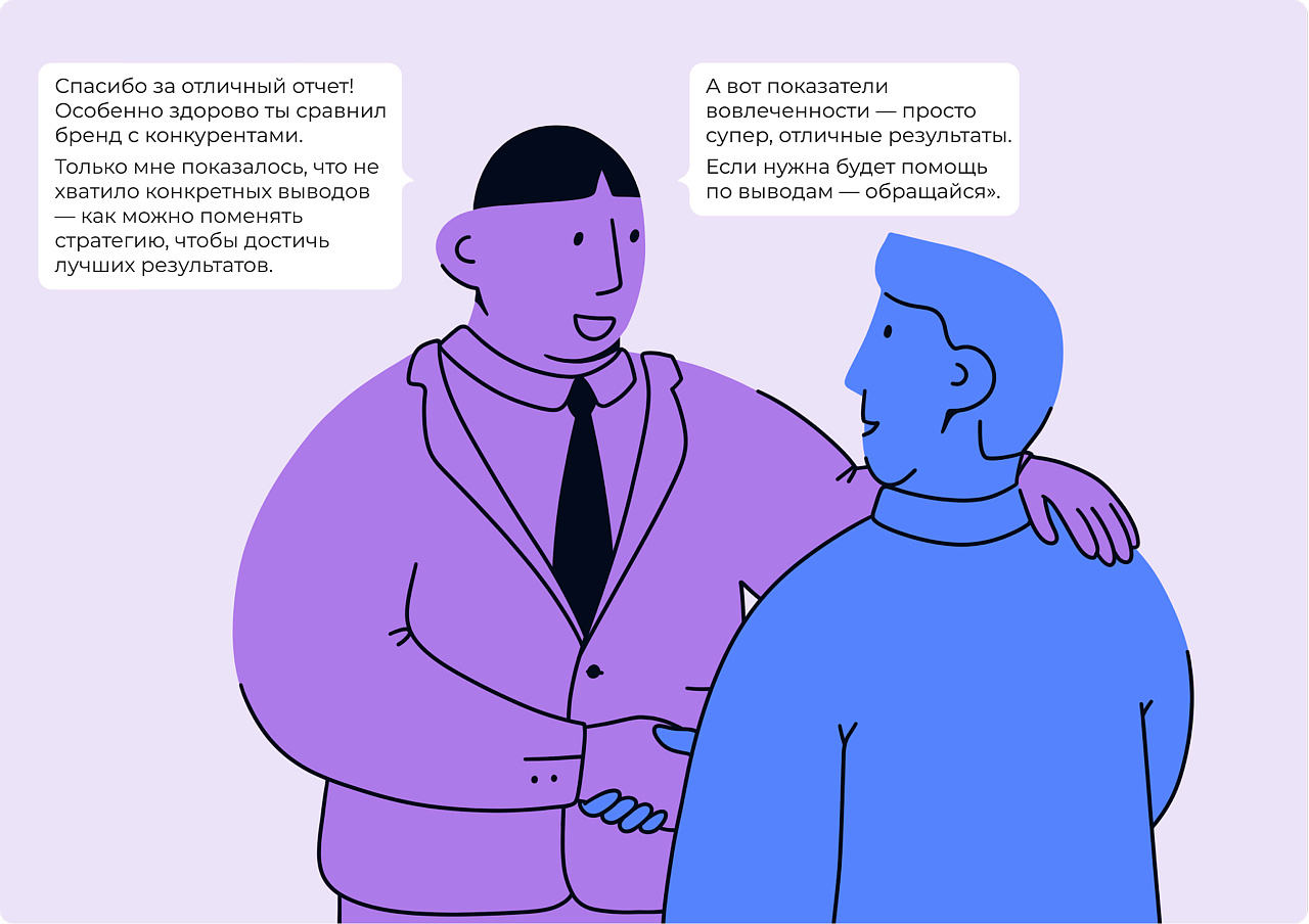 - Научитесь давать обратную связь. Этот инструмент влияет на мотивацию и развитие сотрудников. Взгляд руководителя помогает специалистам не сбиваться с пути к целям компании и улучшать результаты.