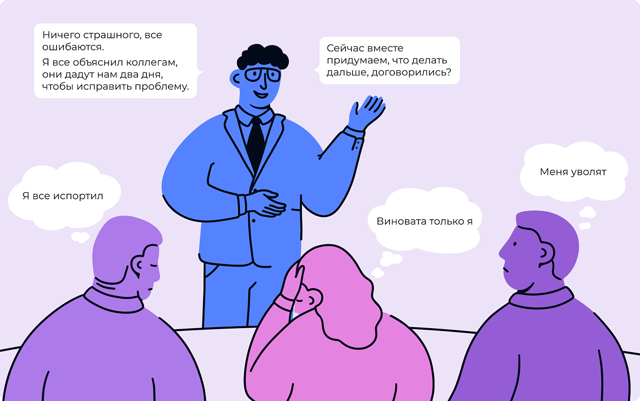 Если сотрудники не выполнили KPI или допустили ошибку — отвечать начальнику. Он не должен искать виноватых или «переводить стрелки»: его задача — признать проблему, решить ее и извлечь уроки.