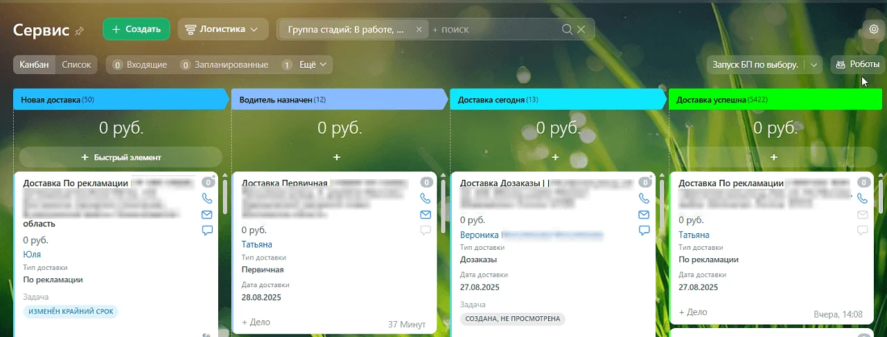 - Настроили автоматизацию. Например, в день доставки CRM сама перемещает карточку сделки на стадию «Доставка сегодня». Так менеджерам легче контролировать статус заказа.