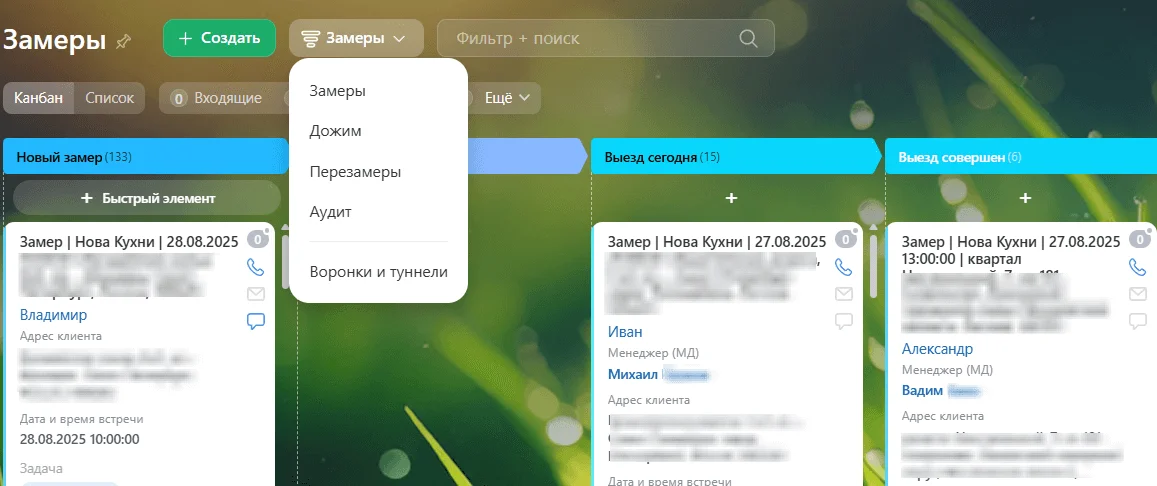 Пока заказов было мало, выездные сотрудники — дизайнеры-замерщики, доставщики, сборщики — могли общаться, передавать данные и координировать работу в мессенджерах и онлайн-таблицах. Но когда клиентов стало больше, процессы усложнились и запутались. Воронка продаж удлинилась, информация начала теряться в чатах. Руководители долго собирали отчеты вручную, но при этом все равно не получали полной картины по бизнесу.