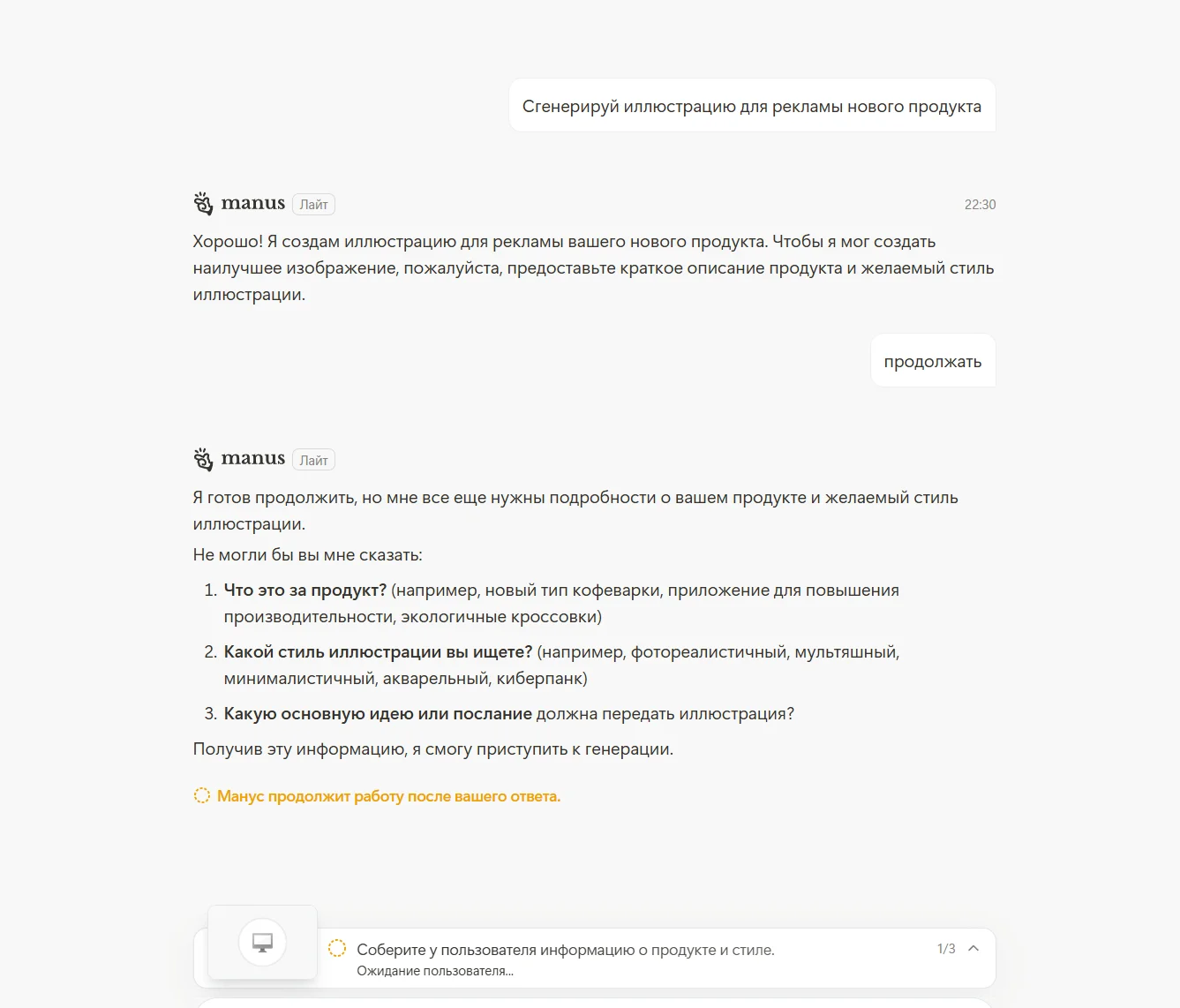 Manus AI с нейросетью умеет создавать и редактировать иллюстрации. Для этого достаточно сделать простой запрос: сервис уточнит детали и определит, что вы хотите сделать. Например, спросит, в каких цветах лучше разработать баннер и какой посыл заложить в изображение.