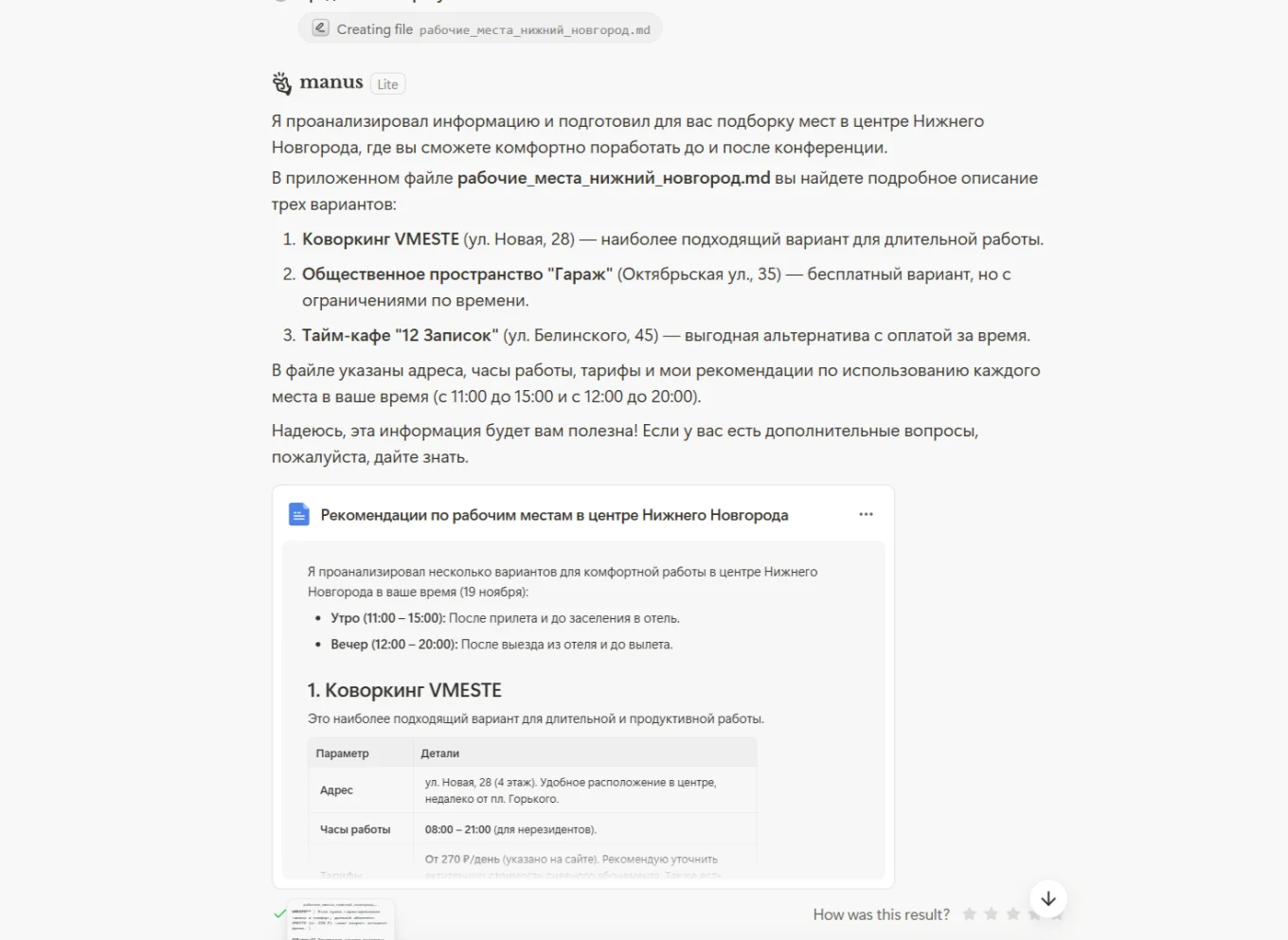 Мы проверили, как действует Manus AI. Для этого спросили сервис, где можно поработать в Нижнем Новгороде. Агент начал искать коворкинги в центральной части города: переходить на сайты, изучать условия и график работы. Когда закончил, предложил три варианта. Дополнительно к списку приложил файл с более подробным описанием и рекомендациями, куда лучше идти.