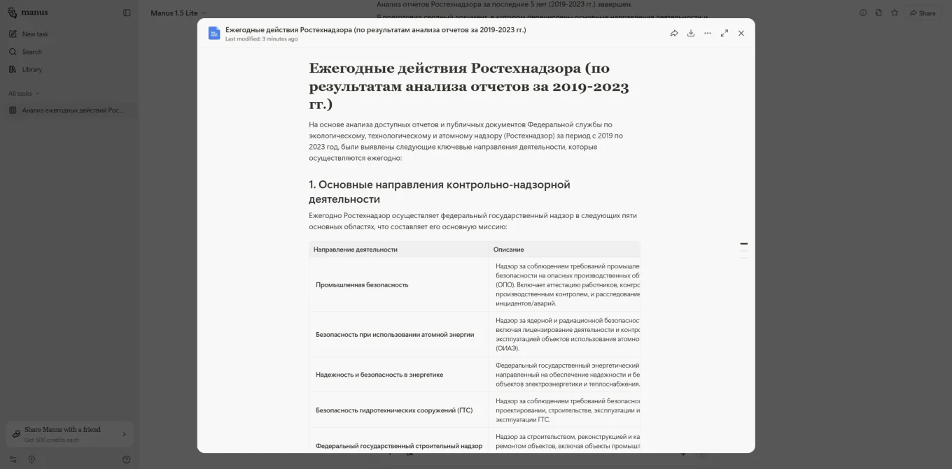 Мы попросили сервис проанализировать ежегодные отчеты Ростехнадзора за последние пять лет и выделить мероприятия, которыми занимается служба. Около четырех минут агент просматривал каждый файл, структурировал и сопоставлял данные. Затем представил краткий список всех действий организации в текстовом формате.