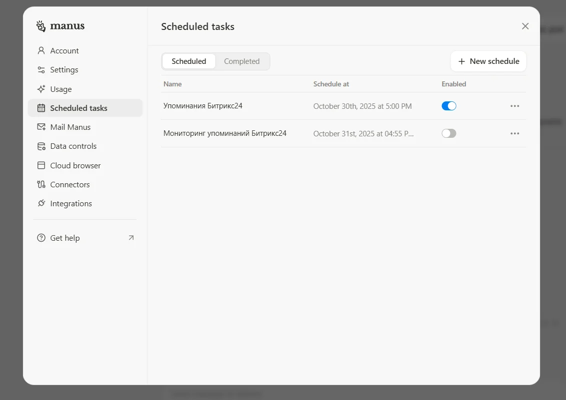 Кроме того, разработчики предусмотрели возможность планировать задачи для агента. Если внести их в расписание, Manus ИИ должен будет приступить к делу в нужный момент.