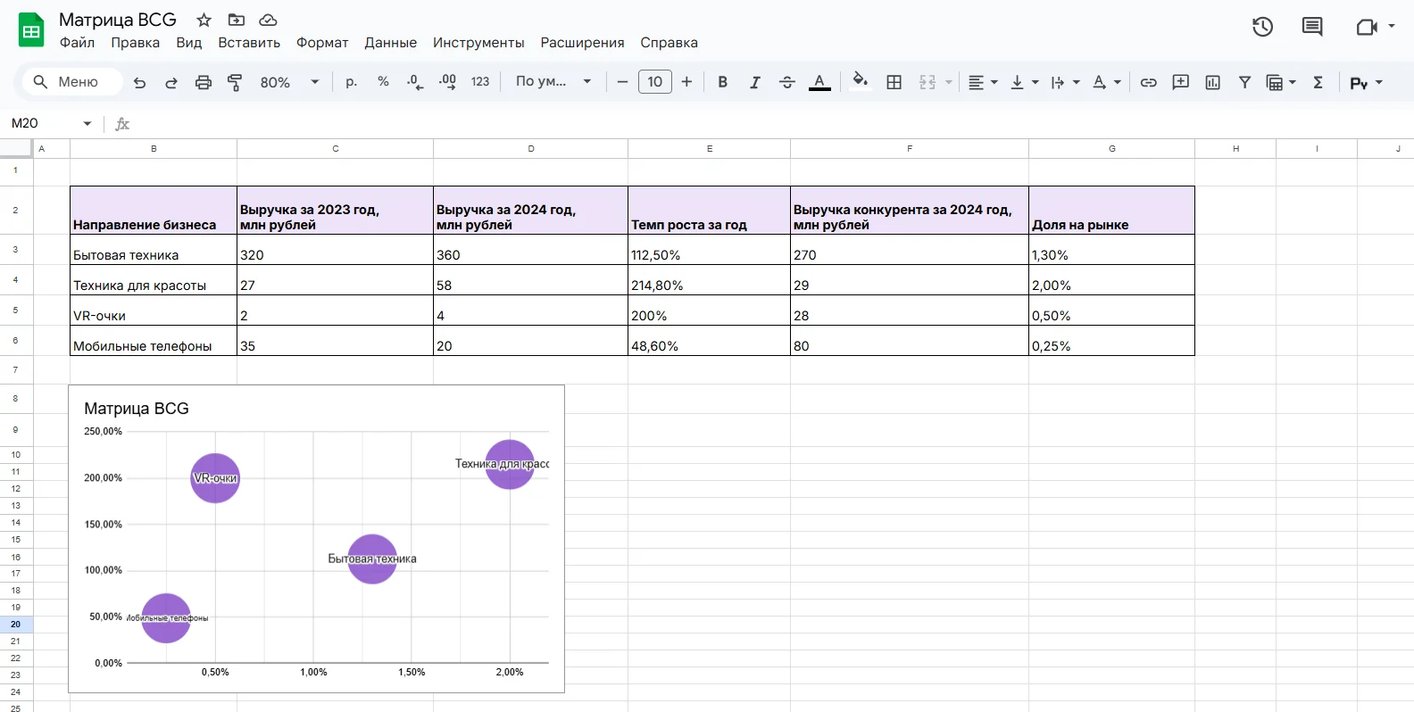 Шаг 3. Составьте матрицу. Для этого можно создать пузырьковую диаграмму в Excel или Google Таблицах. По оси X укажите долю на рынке в процентах, а по оси Y — темпы роста рынка.