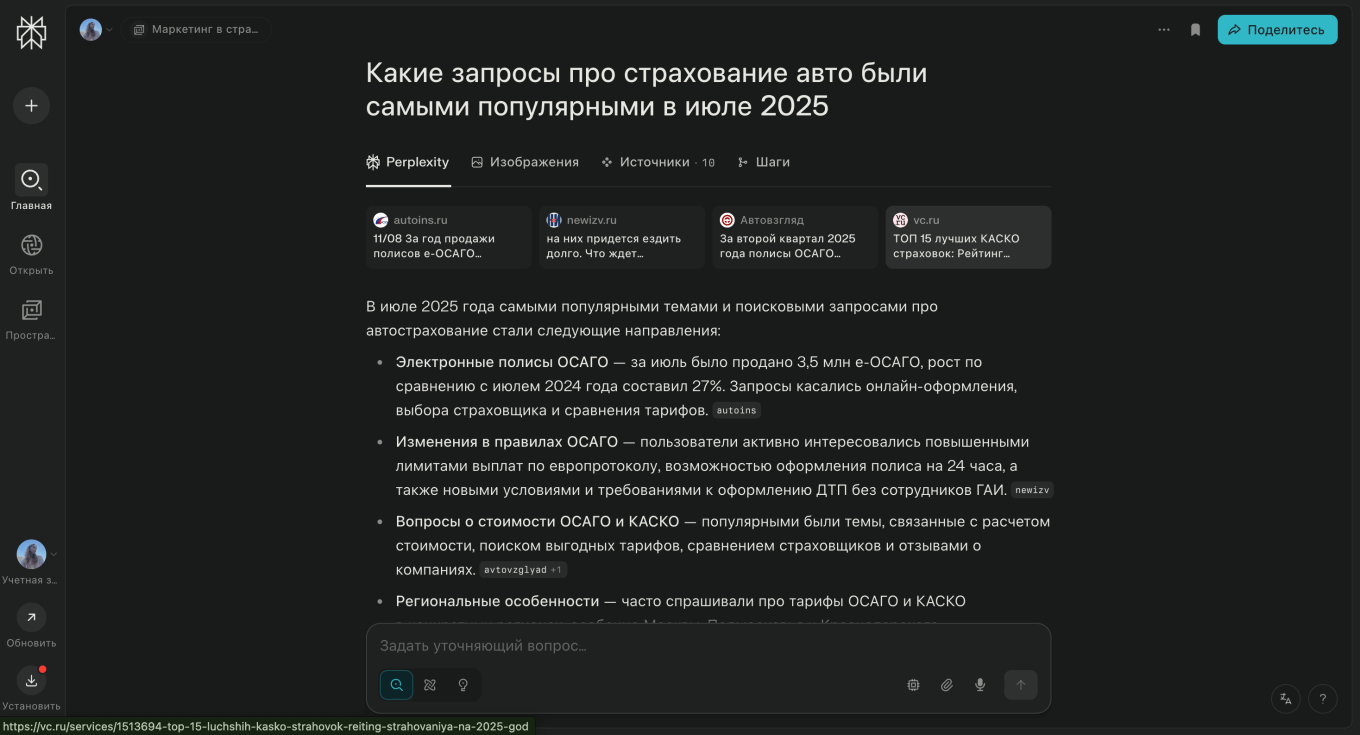 Чтобы не просматривать аналитические отчеты вручную, она пишет запрос в Perplexity AI. Сервис находит свежую статистику по регионам, прикладывает ссылки на отчеты.