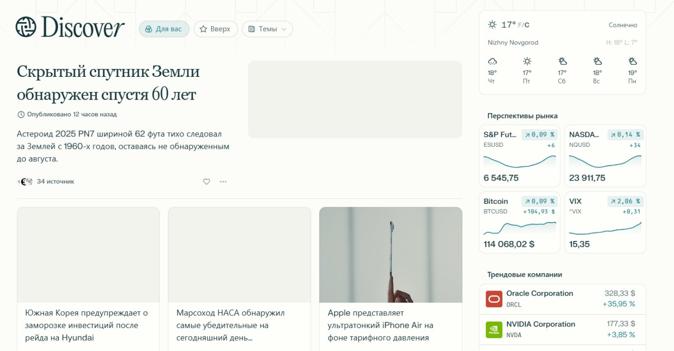 В разделе Discovery сервис собирает популярные новости со всего мира. Perplexity AI предлагает готовые подборки — про искусство, технологии и науку, финансы, спорт — или помогает составить персональную ленту.