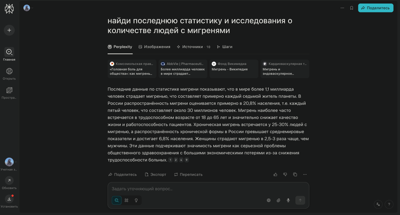 Perplexity AI изучает источники, собирает информацию, структурирует данные и выдает короткий ответ. При этом прикрепляет все ссылки, чтобы пользователи могли сами переходить к источникам. Например, можно попросить найти последнюю статистику о количестве людей с мигренями. Сервис опирается на свежие данные, поэтому выдает исследования последних лет.