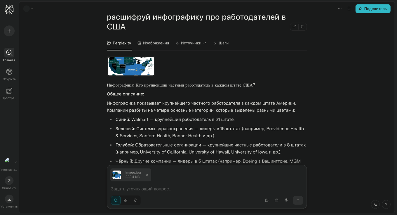 Perplexity AI работает с разными типами файлов — PDF или текстовыми документами, изображениями. Это ускоряет работу — необязательно самостоятельно читать несколько страниц, можно попросить нейросеть написать выжимку, перепроверить факты или перенести информацию с картинки в текст.