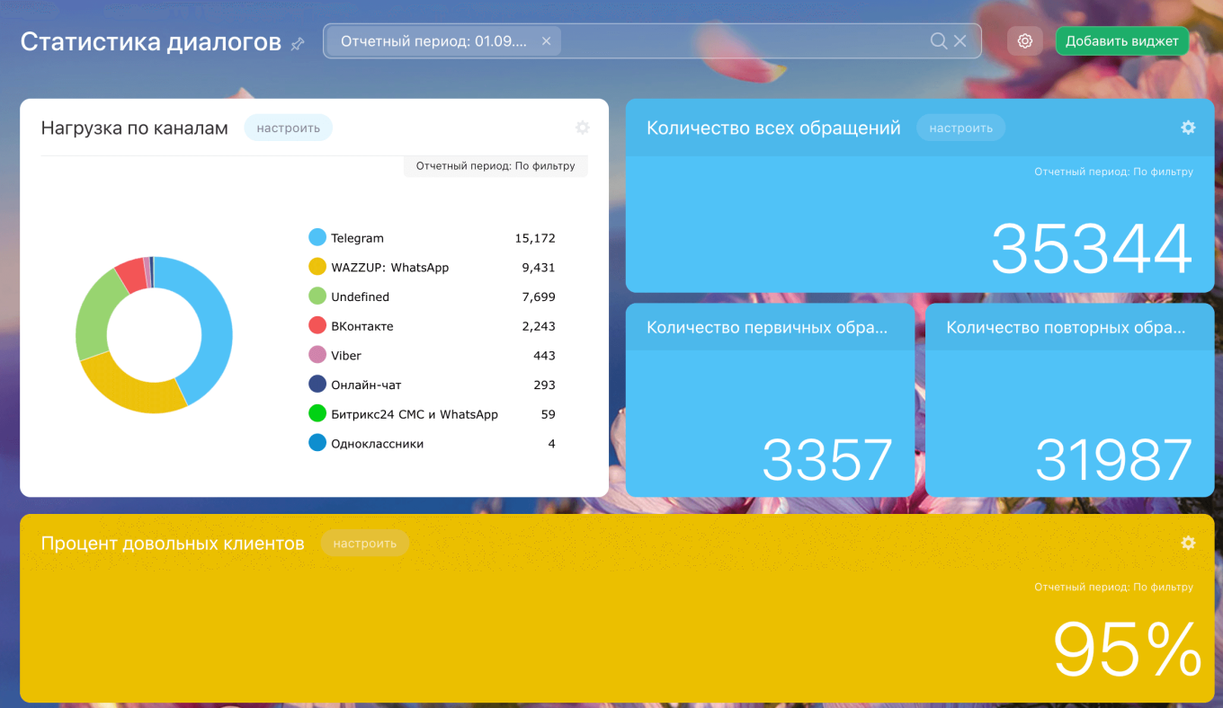 Статистика диалогов показывает, куда чаще всего обращаются клиенты, как быстро они получают ответы и насколько довольны разговорами. Система собирает и обновляет все данные автоматически в режиме реального времени.