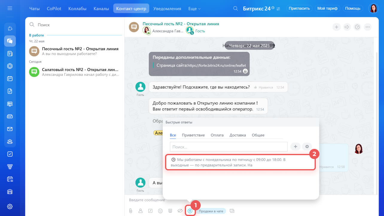 Быстрые ответы в Битрикс24 — это библиотека с шаблонами коротких сообщений. Менеджеры сохраняют готовые фразы прямо в чате с клиентами и группируют их по разделам: например, приветствие, оплата, доставка, возврат товаров.