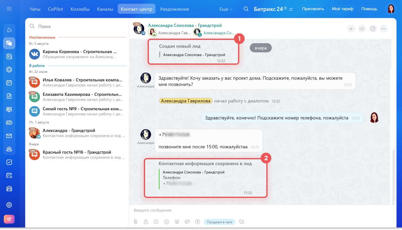 Лучше вести историю общения с клиентом в переписке и использовать эту информацию — адаптировать фразы и сценарии из скриптов под каждую ситуацию. Обращаться к клиенту по имени и ссылаться на прошлые разговоры. Хранить диалоги можно в CRM Битрикс24. Система будет собирать обращения в карточках и подсказывать менеджерам, что писать конкретному человеку.