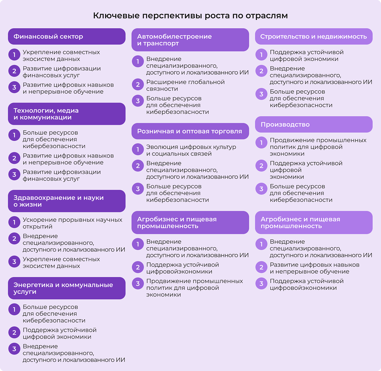У каждой отрасли свой фокус в цифровой экономике. Промышленность делает ставку на специализированный ИИ для решения локальных задач. Там, где большие объемы данных, — IT, медиа, транспорт, розничная и оптовая торговля — в приоритете кибербезопасность.