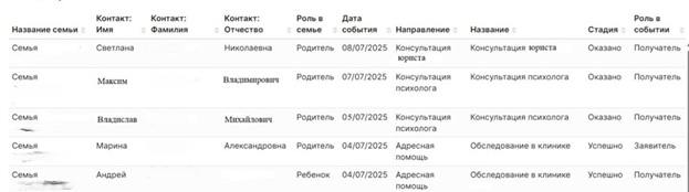 Первый был направлен на персонализированную помощь и точечное управление каждым случаем. Координатору проекта требовалось видеть всю историю взаимодействия с семьей в одном месте, чтобы принимать взвешенные решения о дальнейшей помощи. Это позволяет понять реальную глубину вовлеченности семьи, увидеть, нуждается ли семья лишь в финансировании или в комплексном сопровождении, и работать с семьей как с единым организмом, отслеживая активность каждого ее члена.