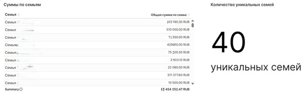 Агрегирует данные: сколько всего событий у семьи, в скольких проектах участвовали, разбивка по каждому направлению работы. Идеально для руководства - сразу видно самые активные семьи и наиболее востребованные проекты.