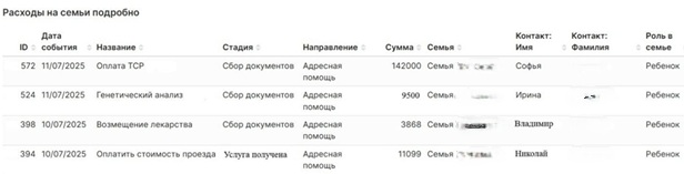 Показывает хронологию всех трат на конкретную семью по направлениям: адресная помощь, консультации специалистов, социальная помощь и др. Автоматически рассчитывается общая сумма потраченных средств на семью за выбранный период.