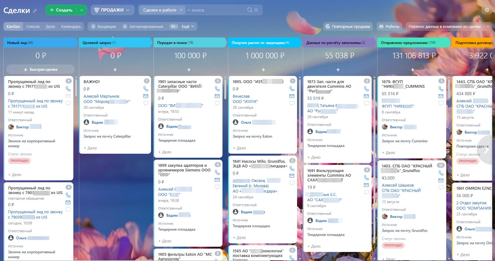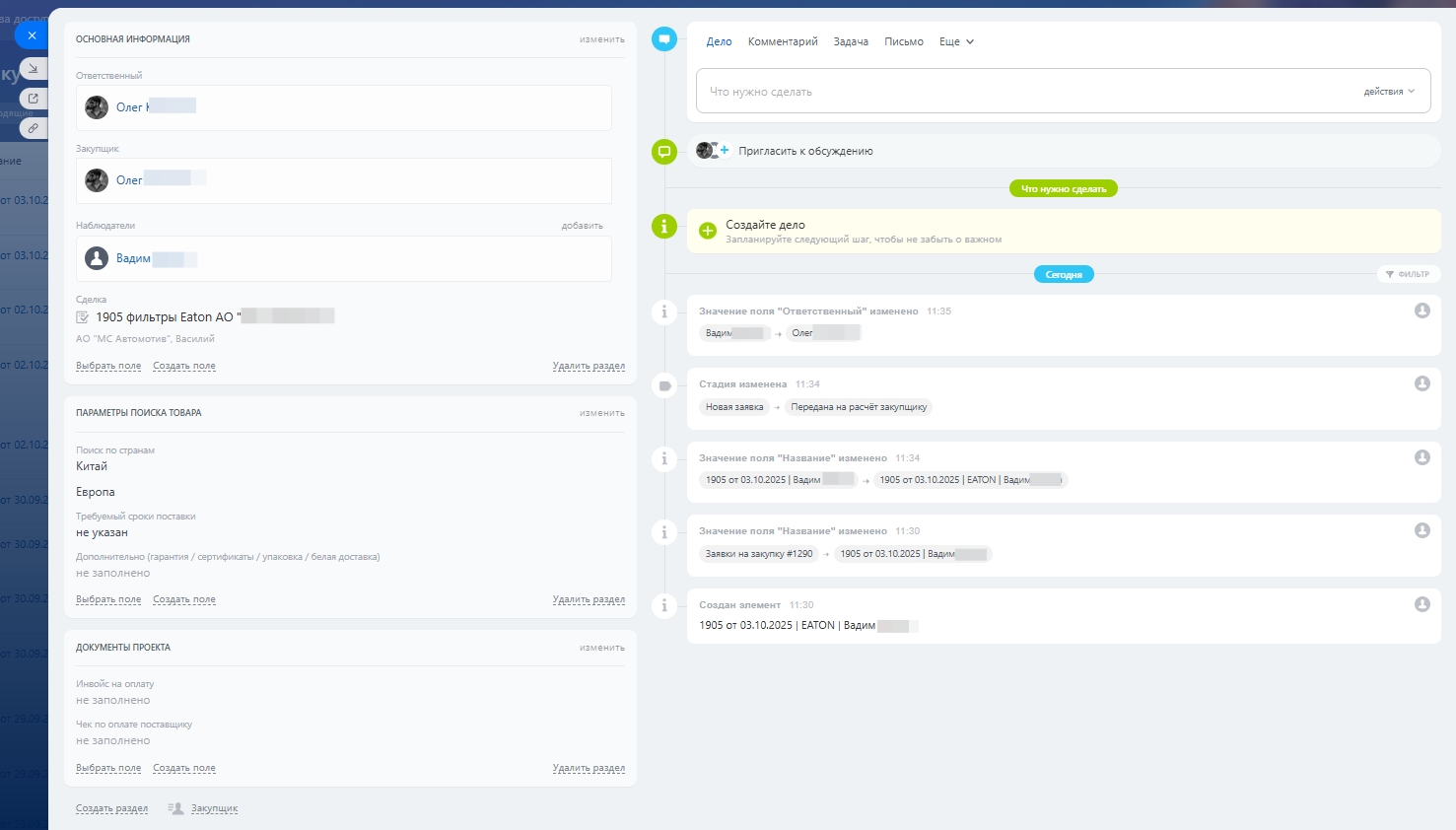Перед клиентом стоял целый комплекс задач, требовавших не просто автоматизации, а синхронизации работы отделов продаж и закупок в рамках одной CRM-среды.