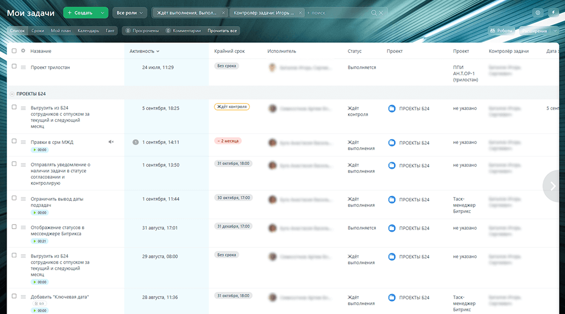 Доработали стандартный функционал «Битрикс24»: добавили роли, фильтры и бизнес-логику, позволяющие сотрудникам быстрее находить задачи и отслеживать прогресс.