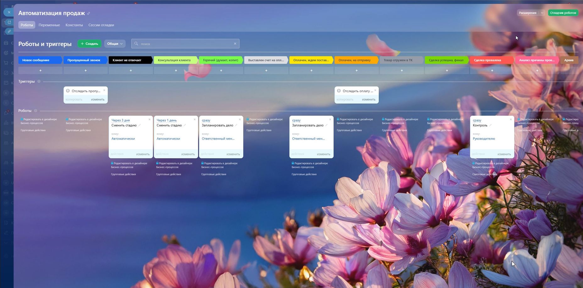 Мы начали с анализа текущей модели работы: провели встречу с владельцем, уточнили потребности, узкие места и желаемую структуру процессов. После интервьюирования была создана полноценная воронка продаж с удобной карточкой сделки. Настроены триггеры для контроля пропущенных звонков, роботы для постановки задач, смены стадий и автоматического реагирования на сделки, попавшие в проигрыш.