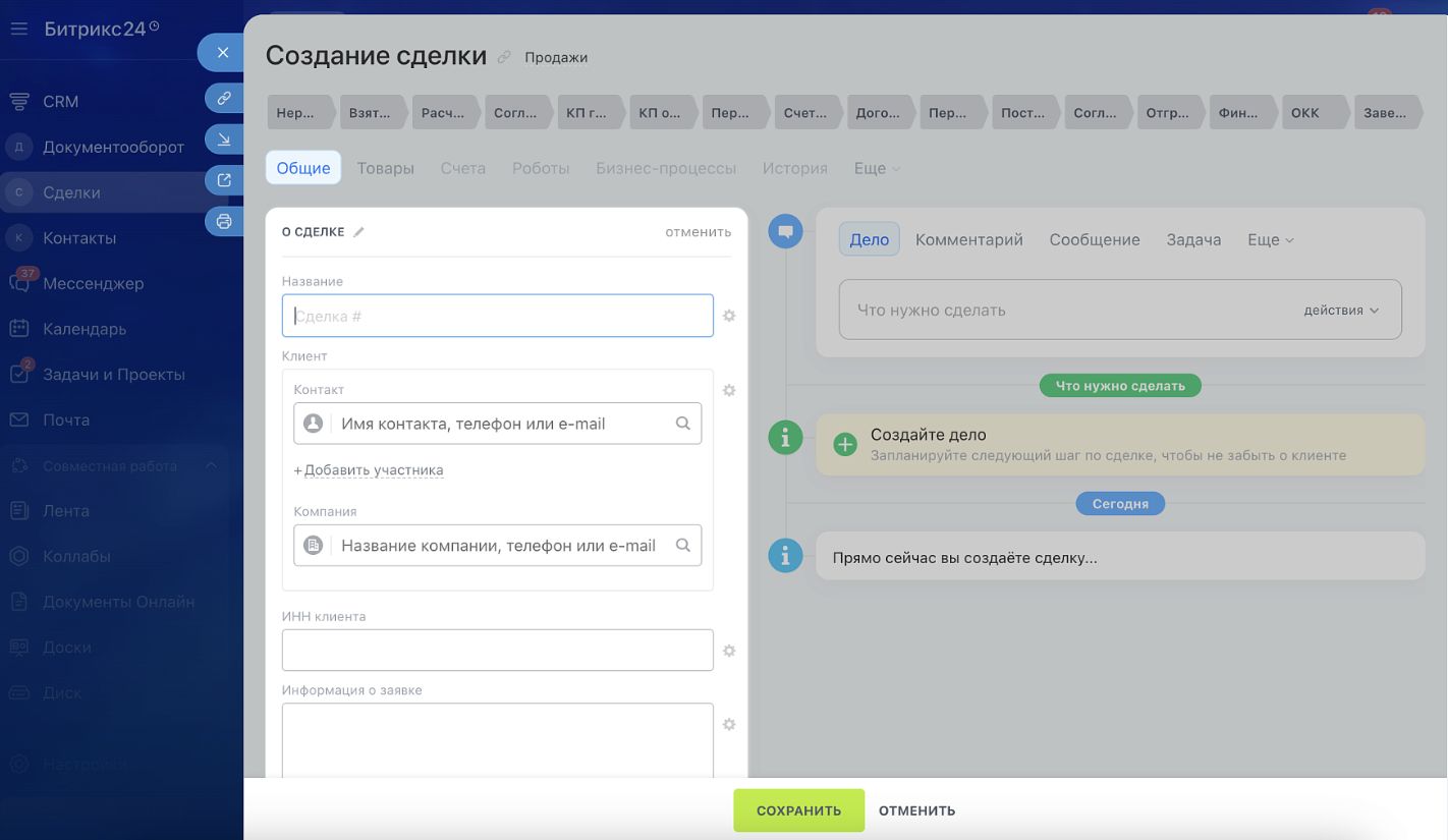 Полный цикл фиксации: Настроена интеграция, аккумулирующая почту, звонки, задачи, встречи и все версии документов (КП, договоры, счета) в карточке Сделки.