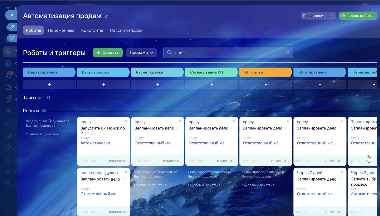 Например: При переходе на стадию "КП готово" автоматически ставится задача "Отправить КП" с дедлайном; при попадании в "Передан в закупку" - автоматический запрос в отдел закупок.