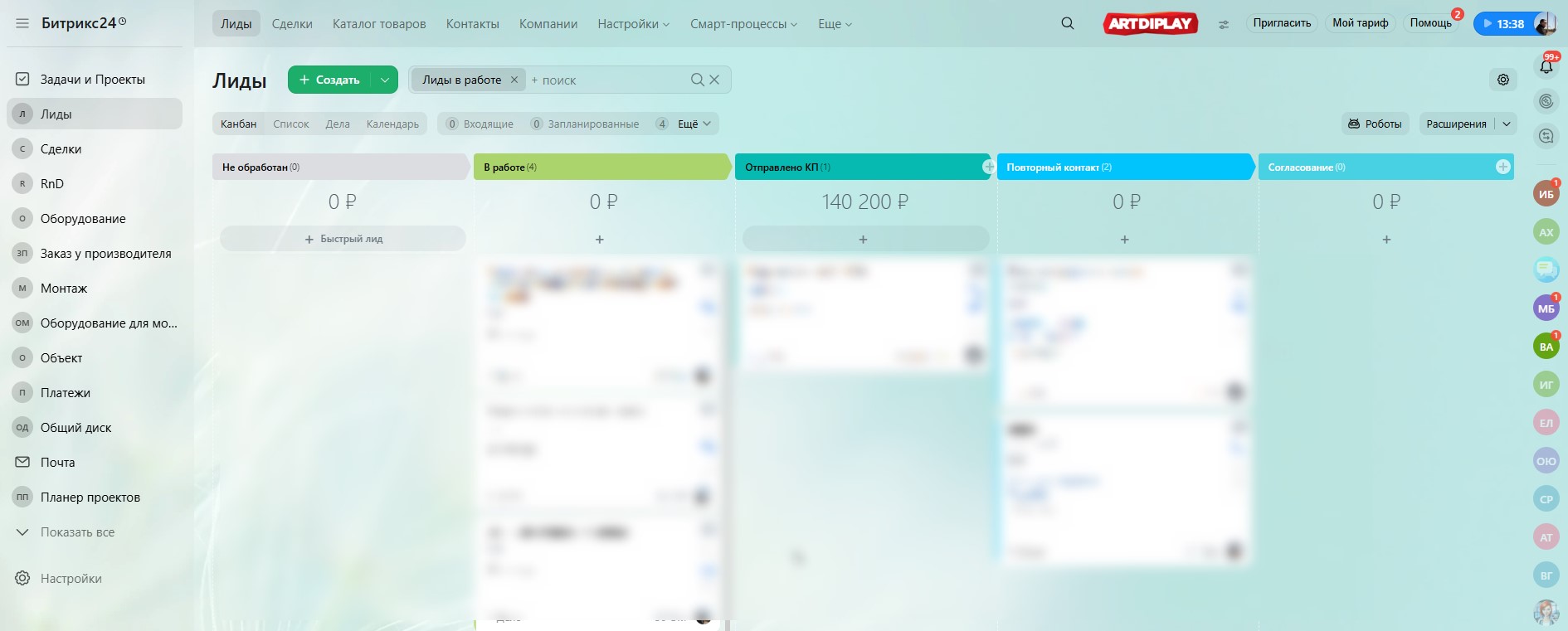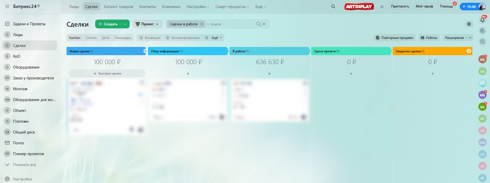 В ARTDIPLAY была выстроена единая цифровая система управления проектами, которая охватывает весь цикл работ — от первого обращения клиента до монтажа оборудования и закрывающих документов. Все процессы реализованы в Битрикс24 и связаны между собой, чтобы проект последовательно проходил каждый этап без потери информации и ручного контроля.