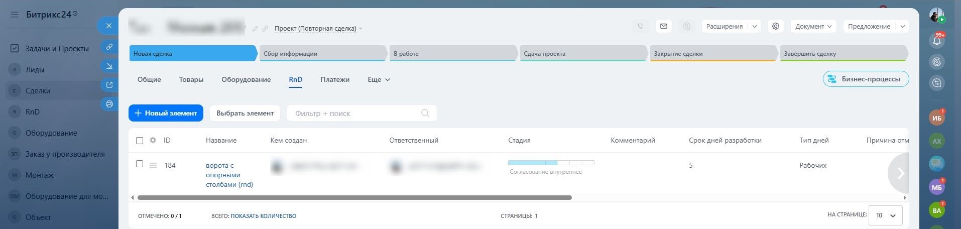 После перехода в проект сделка становится центральной точкой управления всей работой. В её карточке собрана ключевая информация по проекту: задачи индивидуальной разработки, заказы у производителей, оборудование, этапы монтажа, платежи и документы.