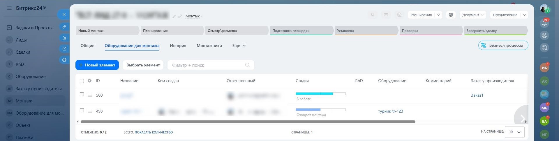 Для проектов с выездными работами используется отдельная воронка «Монтаж» и элементы «Оборудование для монтажа». Ответственные сотрудники видят, какое оборудование и в какие сроки должно быть установлено, и могут планировать работы без дополнительных согласований.