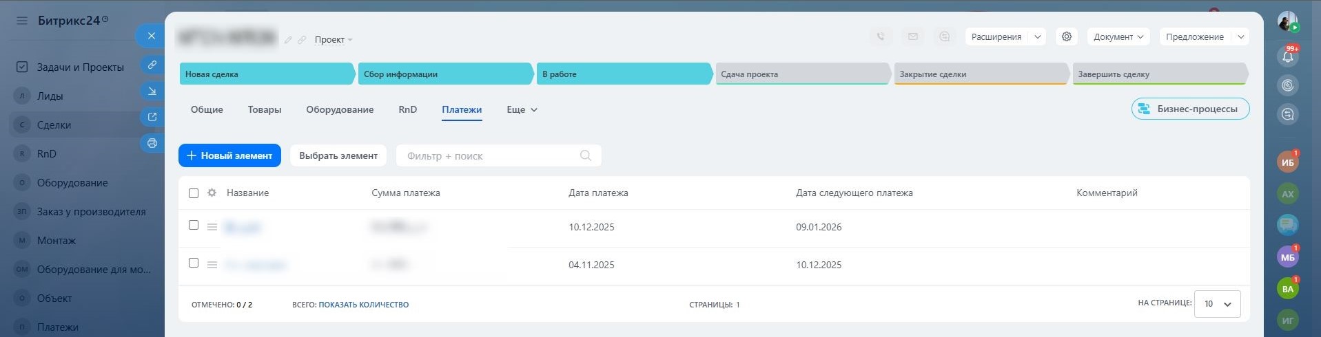 Финансовая часть проекта фиксируется непосредственно в карточке сделки. Видна общая сумма проекта, валюта и текущий остаток к оплате. Каждый факт поступления средств отражается отдельным элементом «Платёж», а система автоматически напоминает о контрольных точках.
