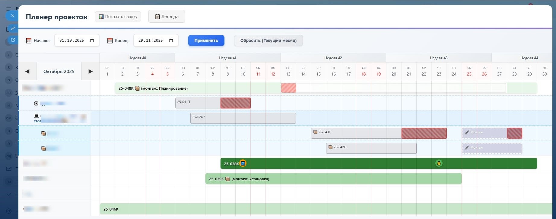 В планере также подсвечиваются критичные зоны: отклонения от плановых сроков, пересечения этапов и потенциальные перегрузки команды. Руководитель может быстро определить, где возникают узкие места и какие проекты требуют приоритетного внимания.