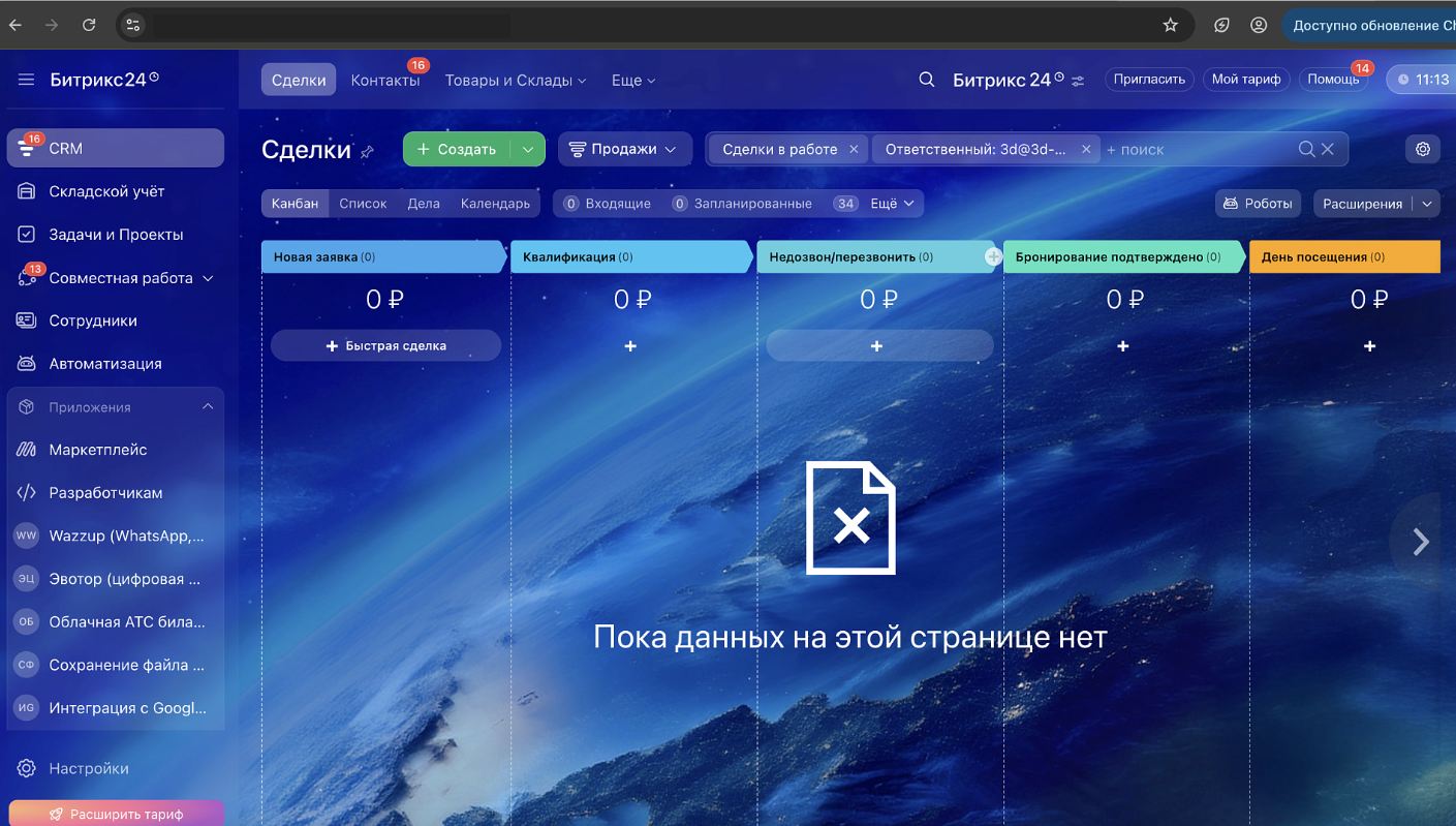 Отдельной задачей стало проектирование и внедрение структурированной CRM-воронки, обеспечивающей прозрачный контроль этапов бронирования, оплат и фактических посещений. Требовалось автоматизировать клиентские уведомления, напоминания и подтверждения, тем самым снизив нагрузку на администраторов и минимизировав влияние человеческого фактора. Дополнительно была поставлена задача создать отдельный контур учёта сертификатов с корректным контролем их использования. В завершение проекта необходимо было обучить сотрудников работе в системе, обеспечить контроль со стороны руководителя и передать клиенту полностью готовое, стабильное решение для дальнейшей эксплуатации.