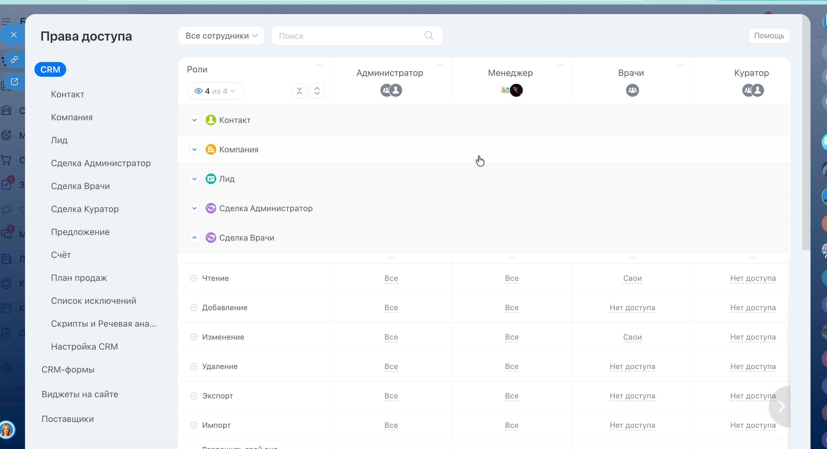 Дополнительно стояла задача разграничить права доступа к данным CRM, чтобы каждый сотрудник видел только необходимую для работы информацию. Это особенно важно для медицинской организации, где требуется соблюдение конфиденциальности данных пациентов.