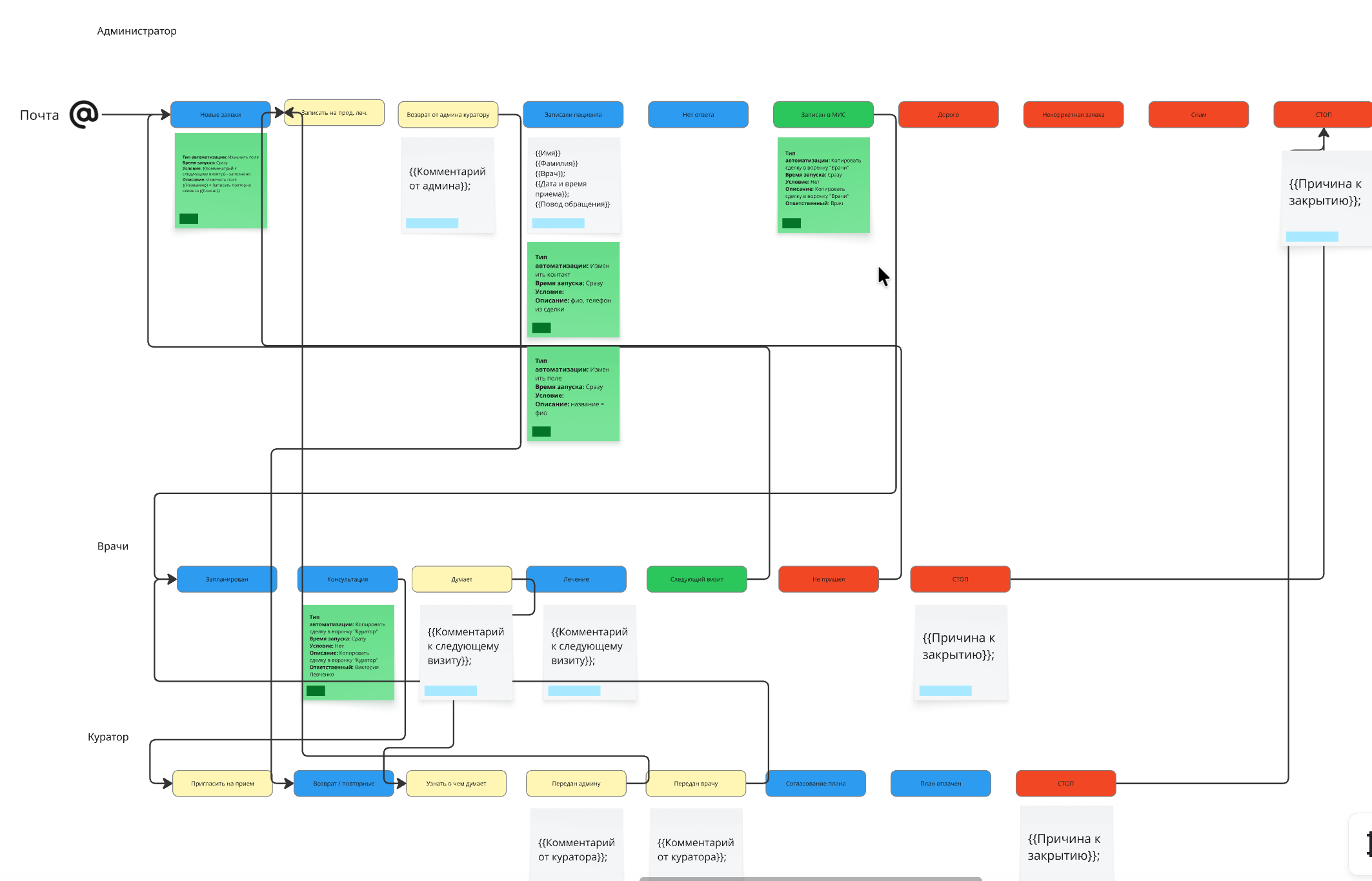 Проект начался с предпроектного аудита и серии рабочих встреч с заказчиком. В ходе анализа были детально изучены текущие процессы работы с пациентами, роли сотрудников и схема взаимодействия между подразделениями. На основе полученной информации была разработана блок-схема бизнес-процессов, отражающая путь пациента от первичного обращения до завершения лечения. Это позволило выявить узкие места и определить точки автоматизации.