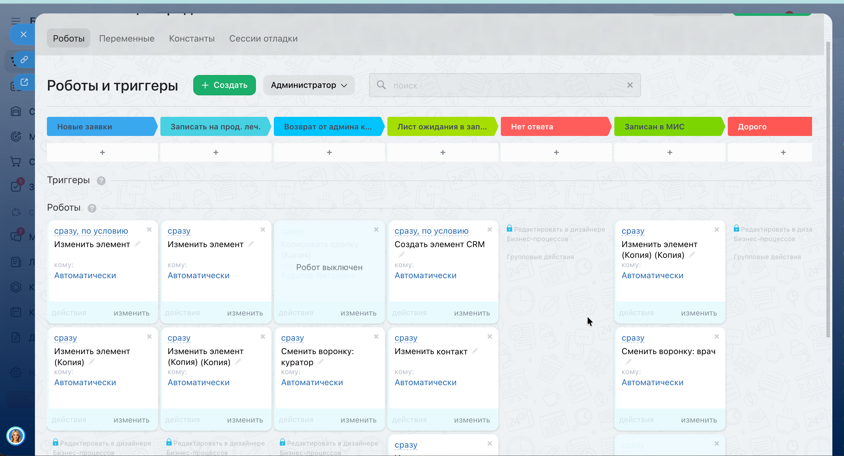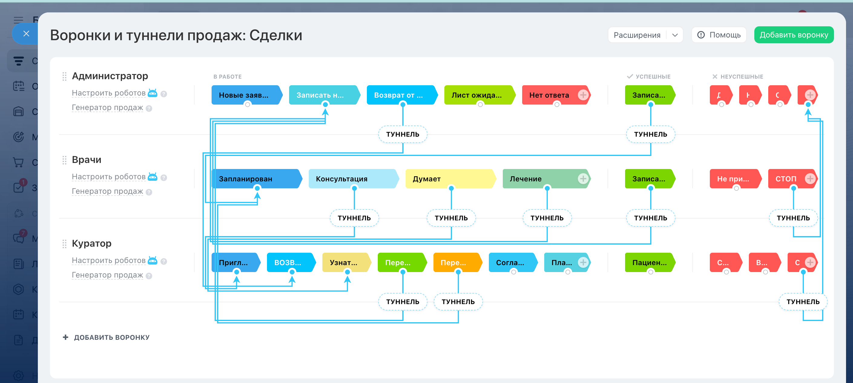 На основе разработанной модели была реализована архитектура CRM. В системе настроены три отдельные воронки: «Администратор», «Врачи» и «Куратор», каждая из которых отражает свою часть работы с пациентом.