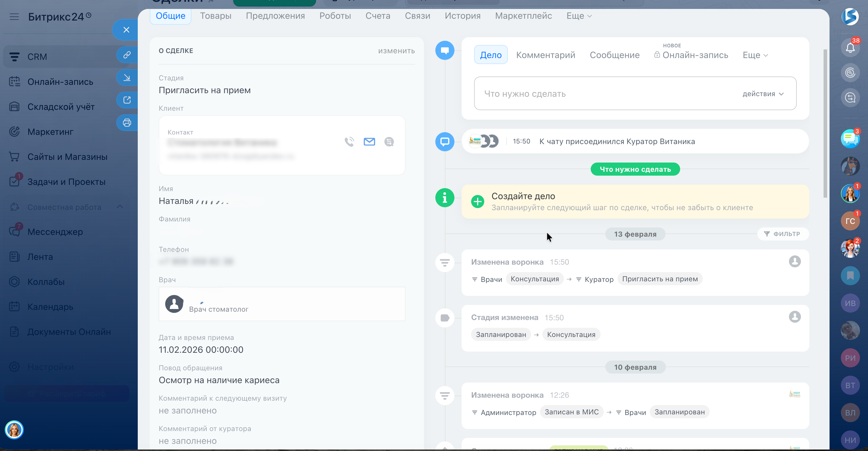 Подготовка пациента к приёму ускорилась на 30% за счёт обязательных полей и структурированной карточки сделки;