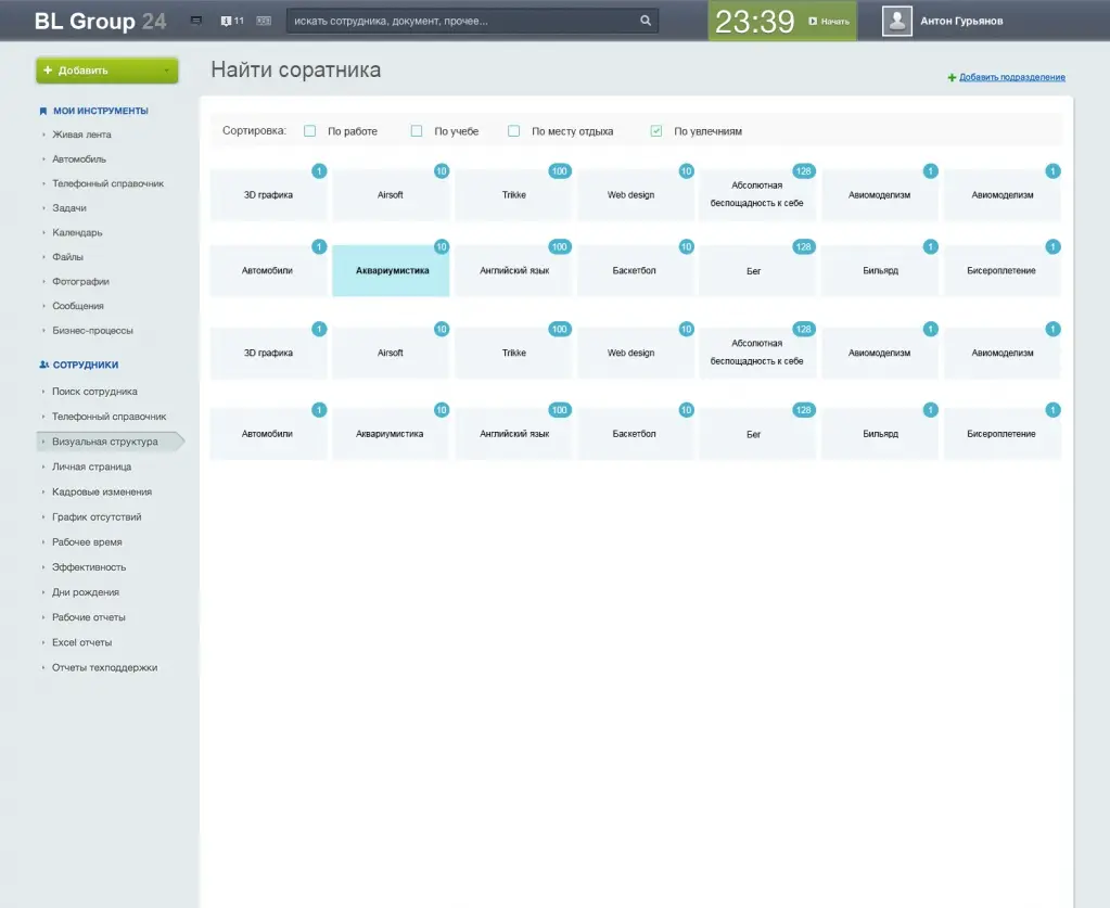 Другим важным инструментом для налаживания внутренней коммуникации стал модуль «Соратники». Он анализирует данные сотрудников и позволяет каждому найти близкого по духу коллегу. Ведь человеку всегда хочется видеть за бездушными профилями людей со своими увлечениями и интересами.