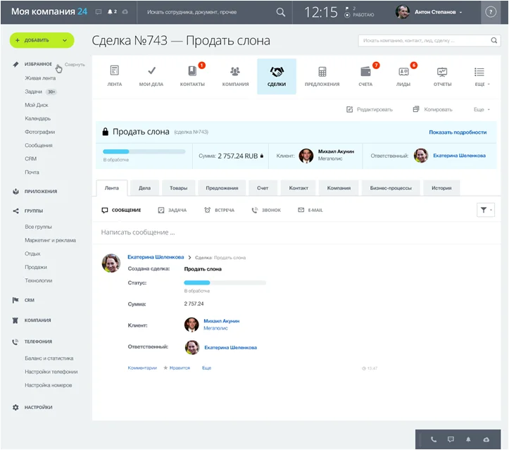 «Руководитель, который отвечает за продажи, заносит в систему всю информацию о заказчиках — не только контакты и суммы оплат, но и важные моменты из переписки. Также он оставляет в карточке каждого клиента, соответствующие комментарии для своих сотрудников, которые видят их в «живой ленте». Бухгалтера же берут из CRM информацию о суммах сделок, реквизитах новых клиентов, счетах. Я, в свою очередь, вижу, как идет каждая сделка и весь процесс работы с клиентами. Всем удобно», — отмечает Татьяна.