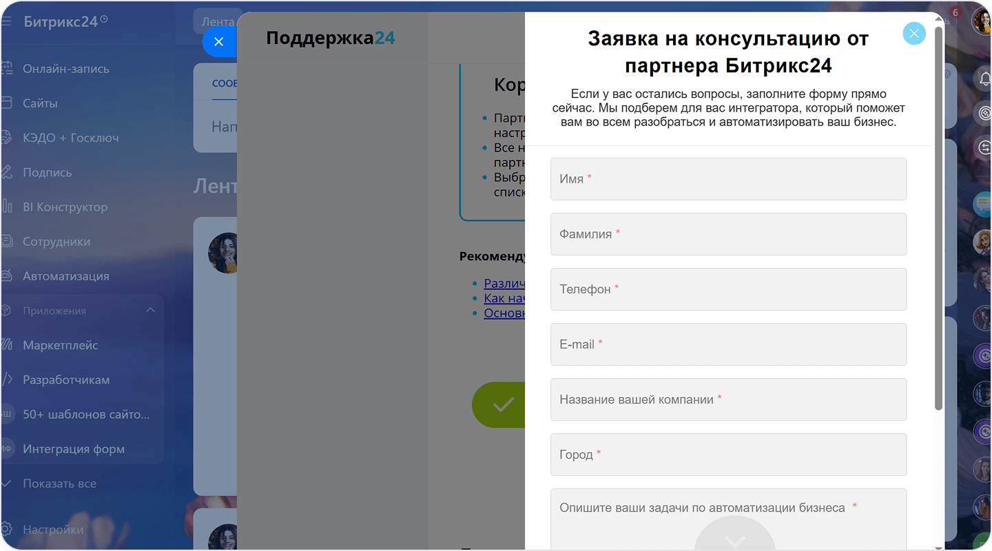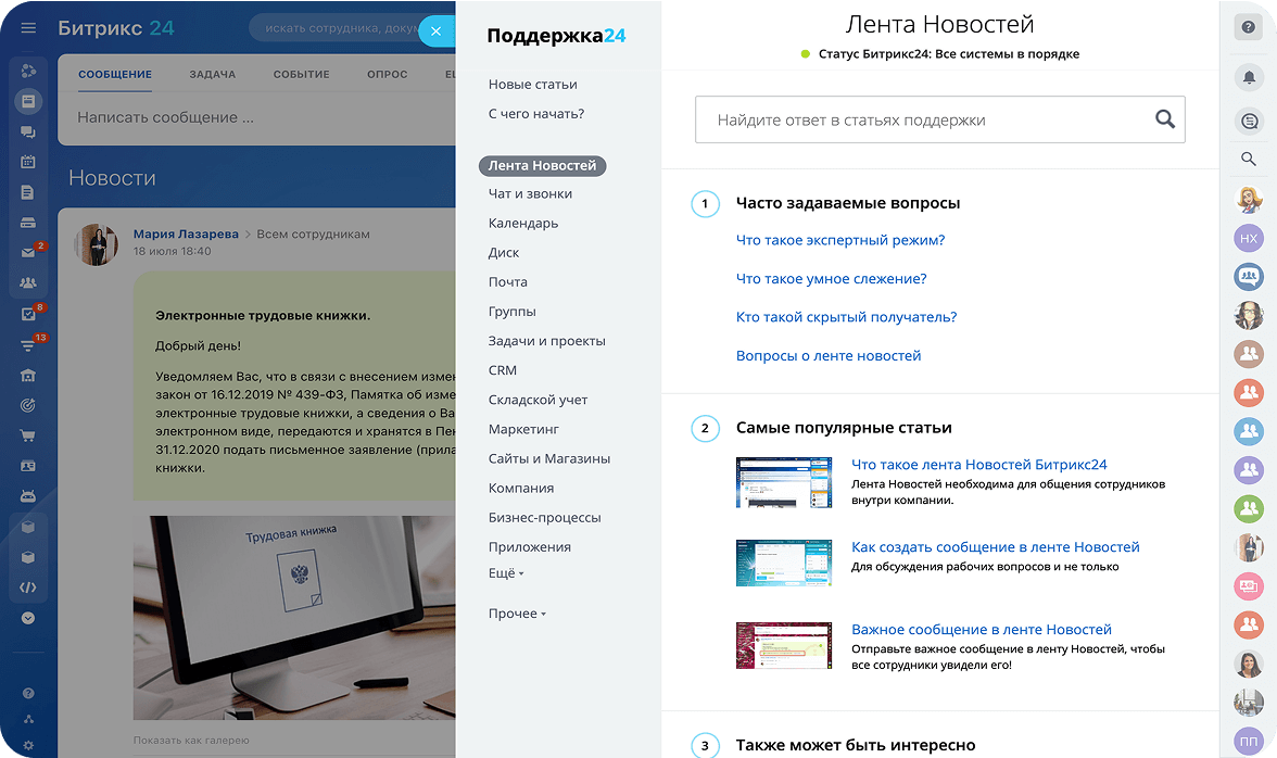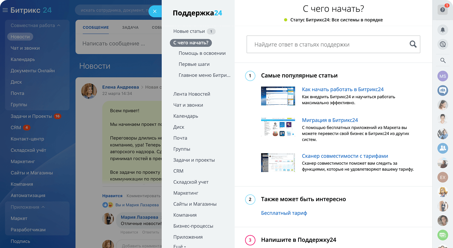 В разделе «Поддержка» вы найдете ответы на 95% вопросов обо всех инструментах Битрикс24.