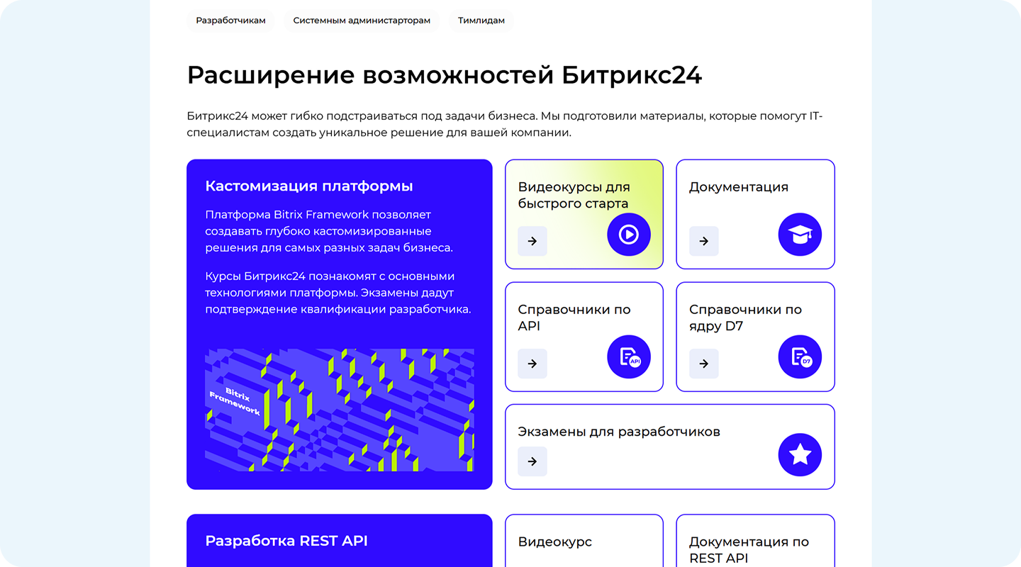 Разработчикам готовых решений и интеграций будет полезен курс по REST API. Он полностью посвящен разработке локальных и тиражных приложений.